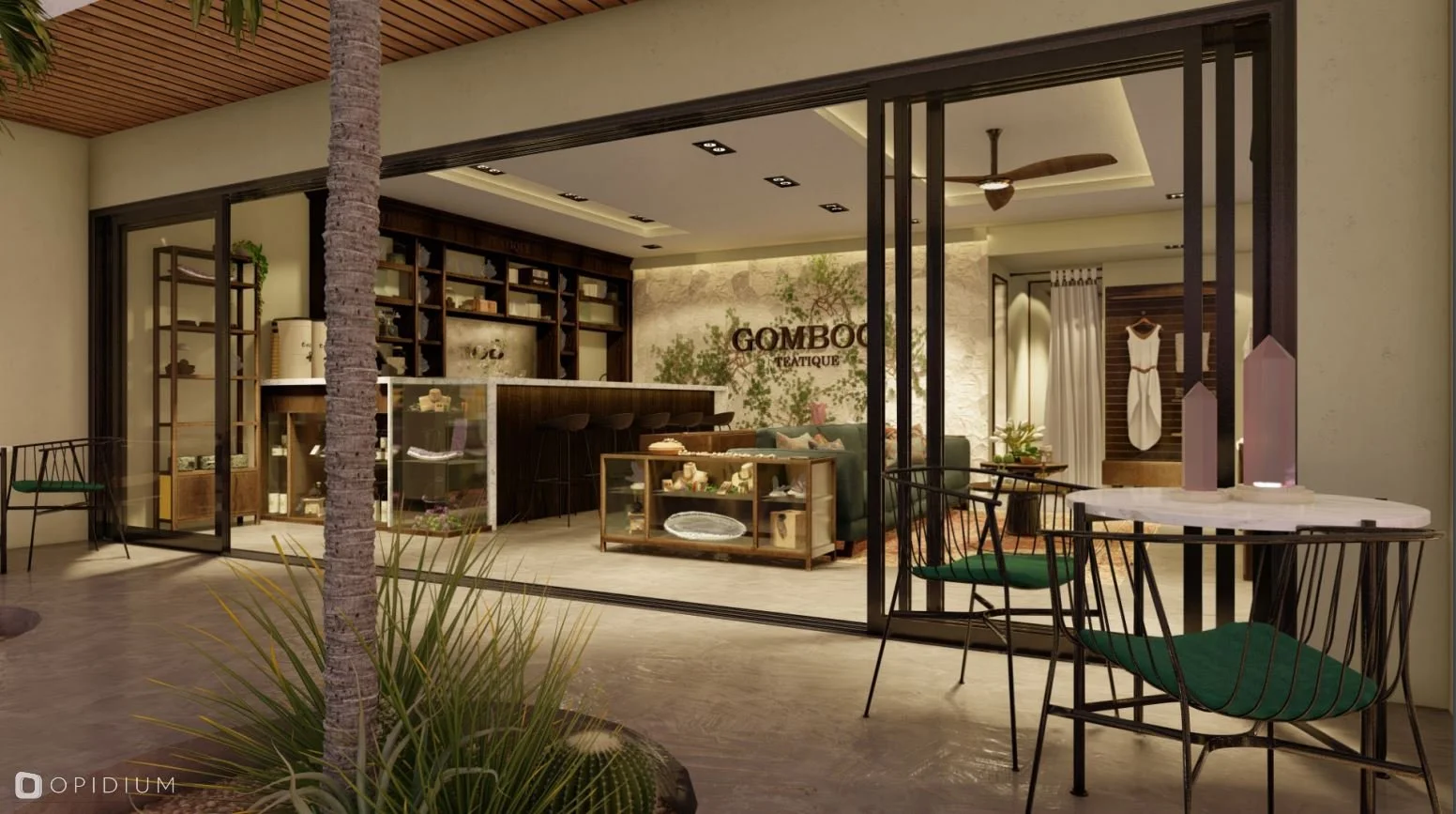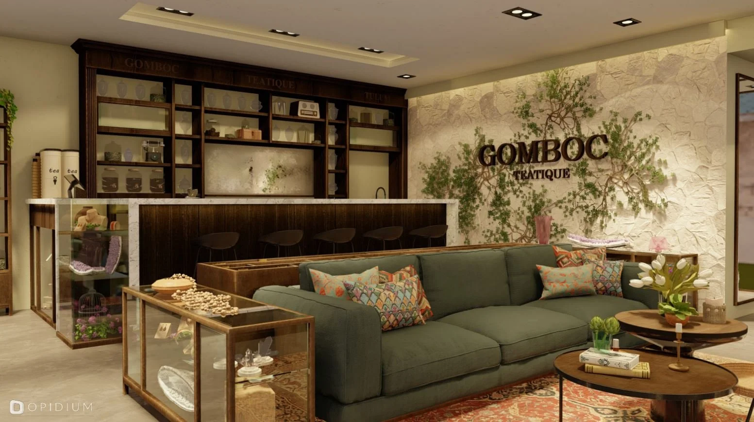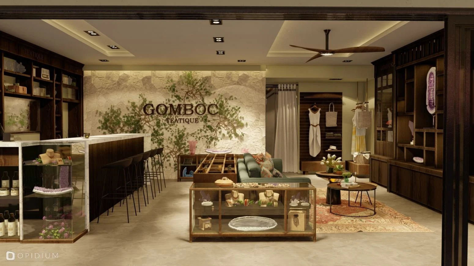 Gomboc Teatique es una boutique, ubicada en el corazón de la zona comercial de Aldea Zama, fusiona una galería de arte y piedras preciosas con un espacio para la degustación de té, creando un concepto que combina calidez, elegancia y eclecticismo contemporáneo.