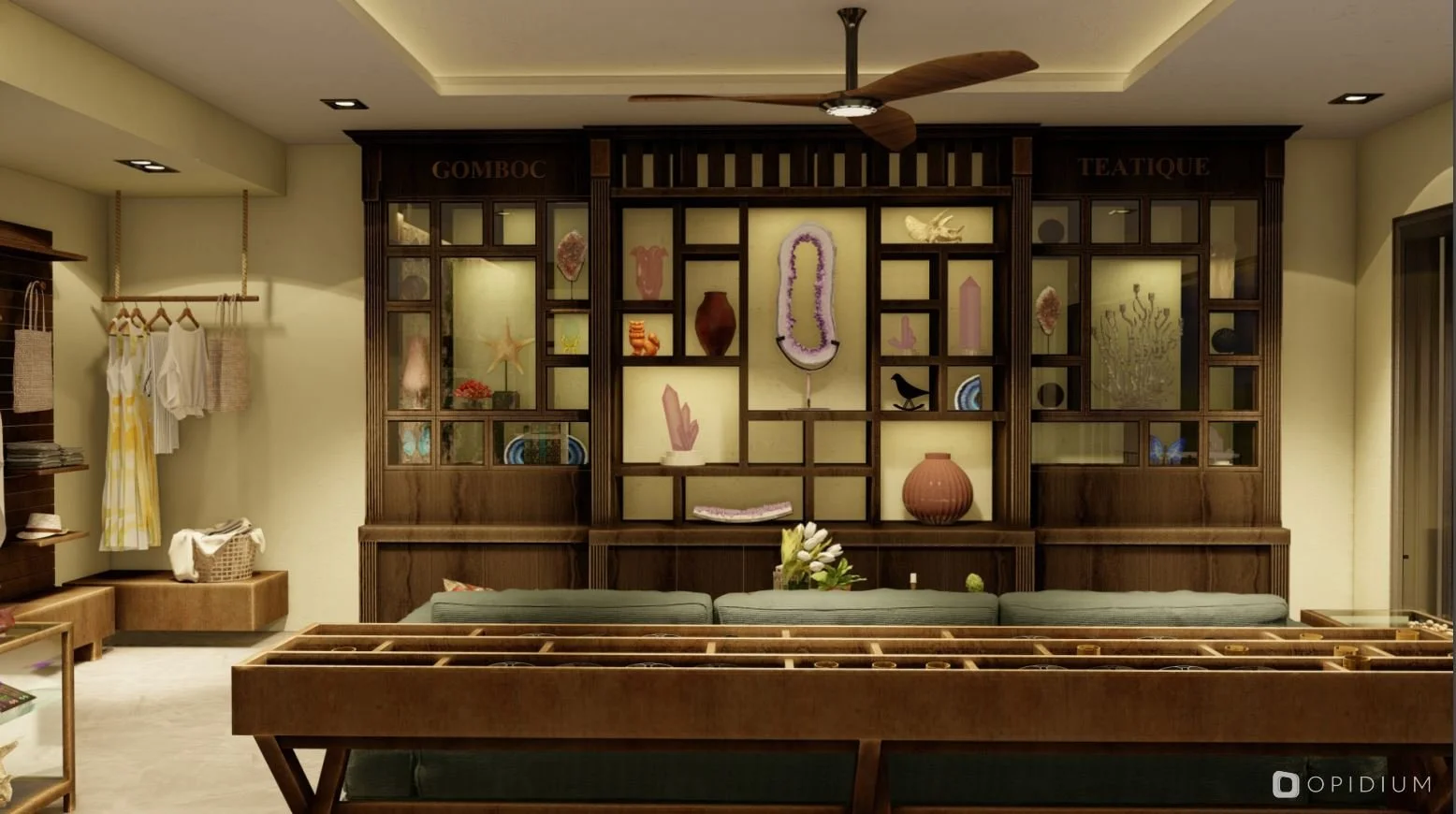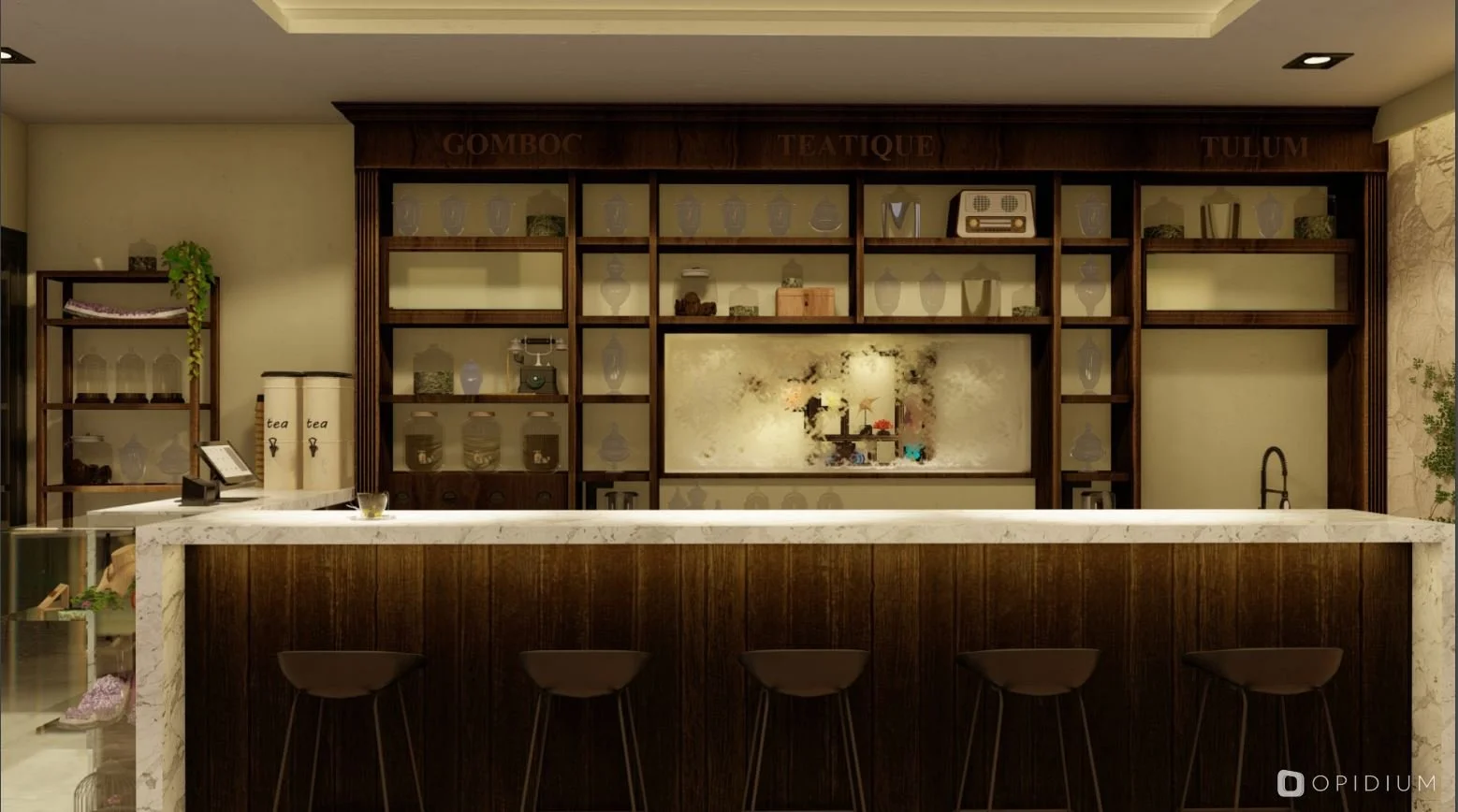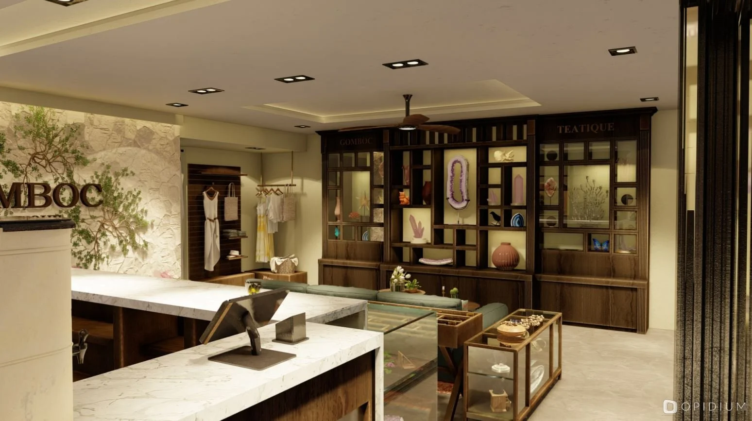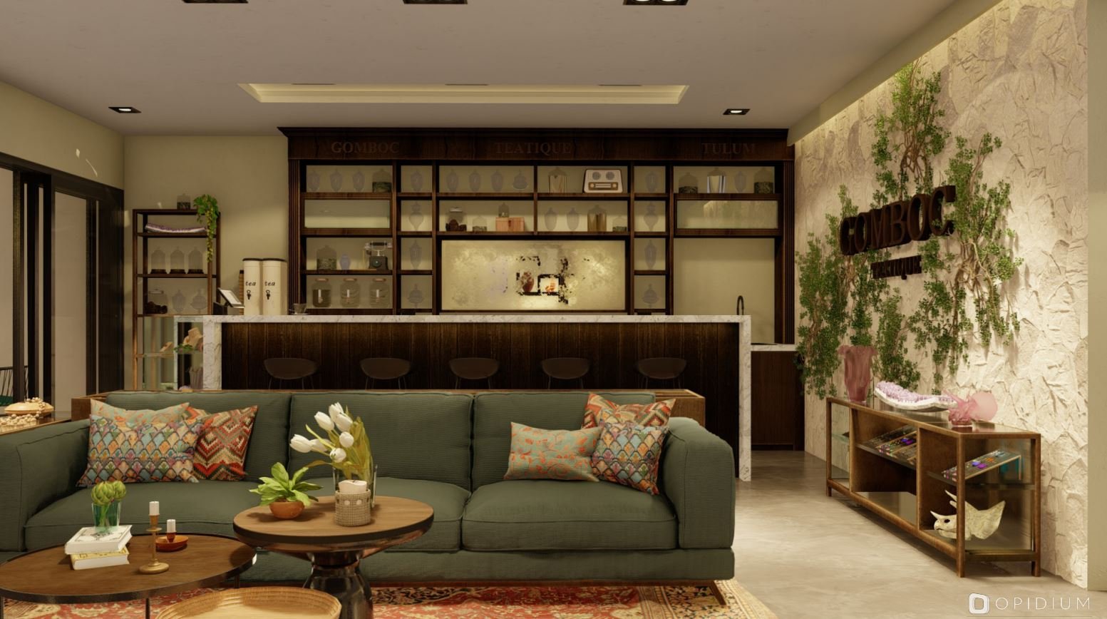 Gomboc Teatique es una boutique, ubicada en el corazón de la zona comercial de Aldea Zama, fusiona una galería de arte y piedras preciosas con un espacio para la degustación de té, creando un concepto que combina calidez, elegancia y eclecticismo contemporáneo.